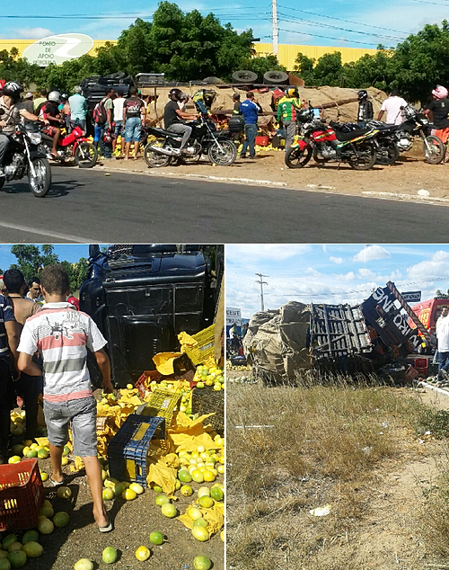 Nesta quarta-feira(10), por volta das 13.45, um caminhão carregado de frutas, ao fazer a rotatória do Bairro Ouro Preto no sentido Avenida Sete de Setembro , tombou e espalhou frutas por todos os lados. Segundo o SAMU, duas pessoas ficaram levemente feridas e foram atendidas nas unidades de saúde da cidade e estão fora de perigo.
